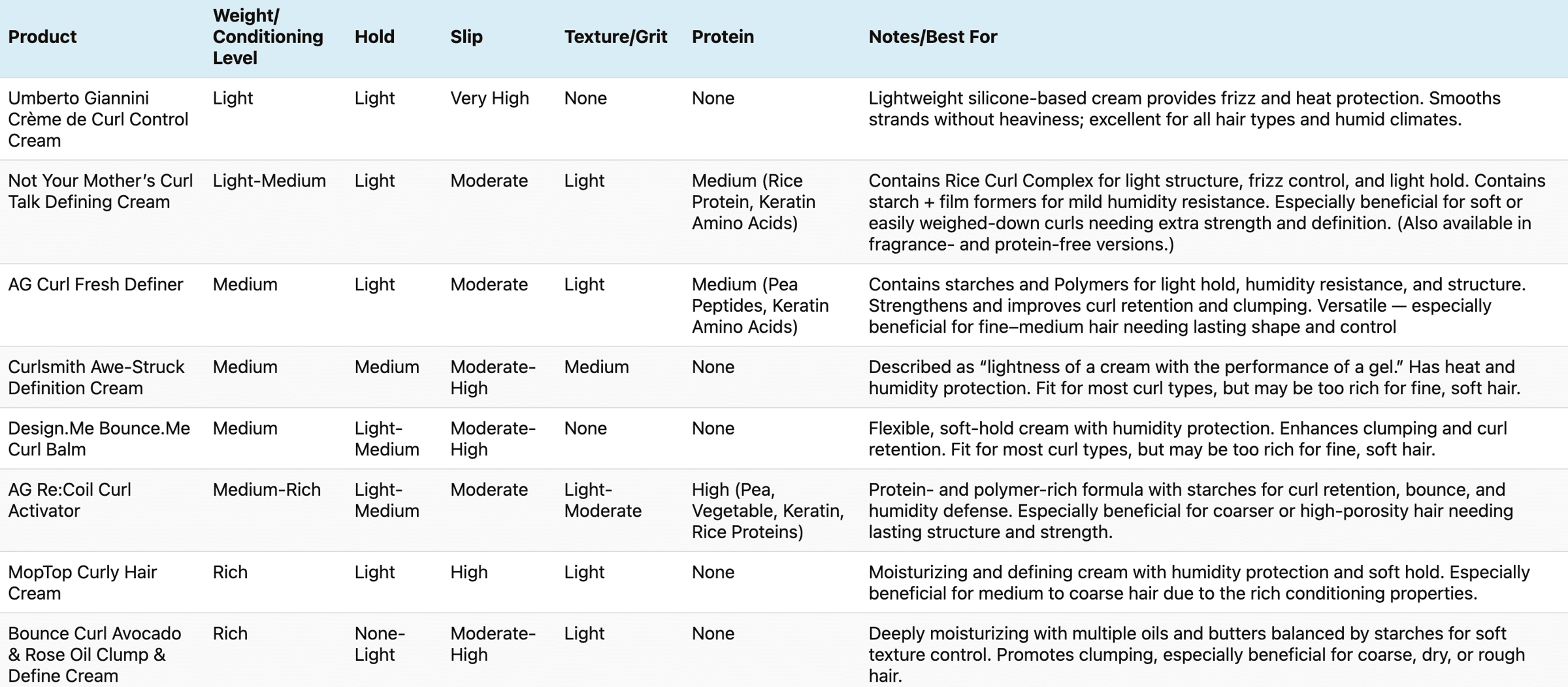 Bounce Curl Avocado & Rose Oil Clump and Define Cream Benefits: Enhances clumping For the full list of creams to compare, click the table below to view fullscreen:Should you even use a curl cream?If your hair already feels soft or easily weighed down, you might not even need a curl cream at all — a lightweight leave-in (or just gel) may be enough. But if your hair feels rough, dry, or coarse, a richer cream can help add that softness and slip your curls need. Need additional help?Download my free Moisture Balance Chart to learn how to pair the right products together for long-lasting definition and softness, and take my free Hair Type Quiz to discover your porosity, texture, and the best products for your unique routine. If you’re ready for more hands-on guidance, join the waitlist for my Curl Coaching Program to get personalized support, product recommendations, and live help with your wash day and styling routine.