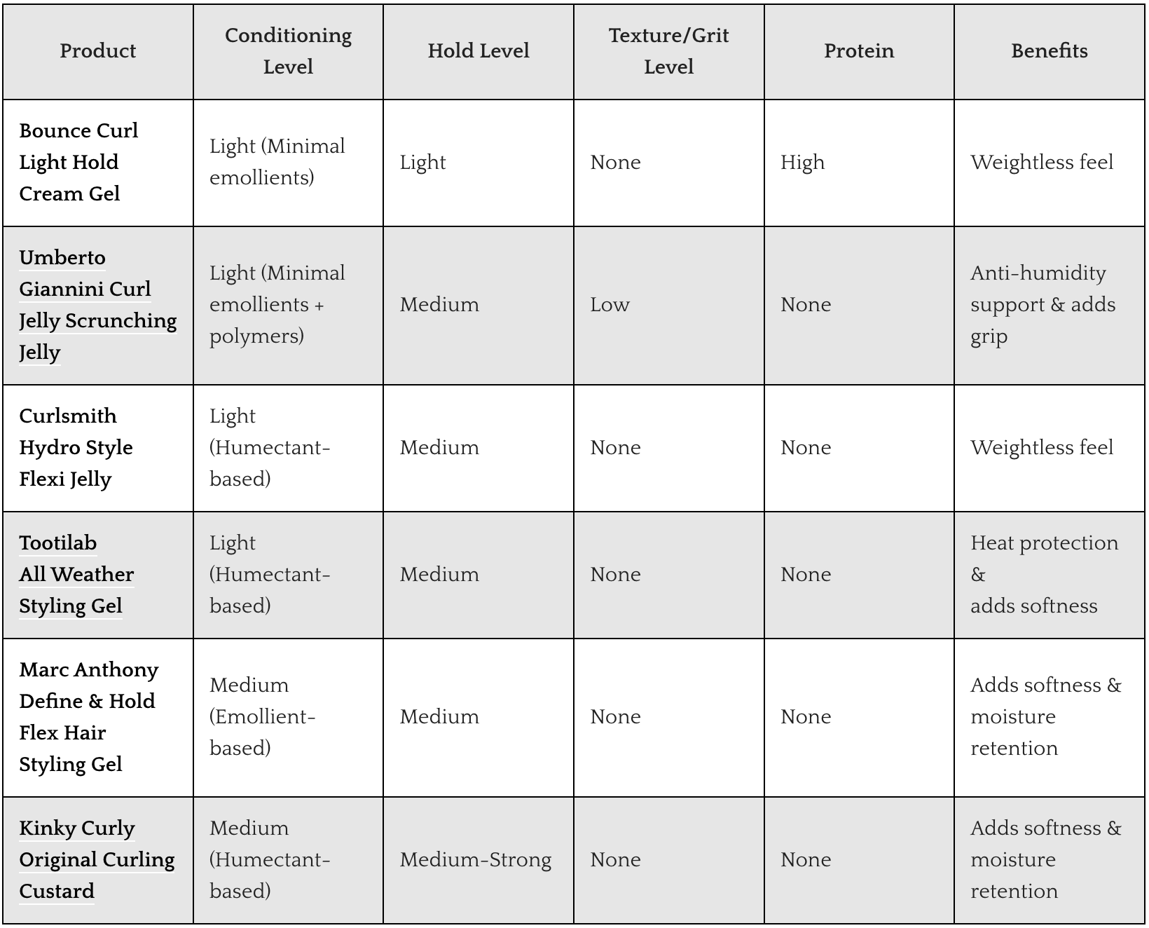 Kinky Curly Original Curling Custard Best Light & Medium Hold Gels Comparison ChartHow to ChooseRemember, this isn’t really about the time of year. Your results depend more on humidity levels and what your hair needs to last. Strong-hold stylers are still great year-round, especially if you want maximum longevity or live somewhere humid. These gels are simply the ones I love using in dry or mild humidity because they’re lightweight, flexible, and great for hair that gets weighed down easily. Some of them — like Umberto Giannini — even hold up really well because of the polymers, which are totally fine in dry or mild conditions. To maximize the hold of these gels, use the Strong Hold Method Cheatsheet. If you need help choosing the right gel, you can use my How to Pick Gels Chart as a guide. Check out my Shop Page, where you can filter products by hold level, conditioning level, and more to find exactly what you’re looking for. And if you want support picking products that are right for your hair — and learning how to properly test them to know whether they truly work for you — my Winter Group Curl Coaching Membership is open for enrollment through December 31st. You don’t have to guess anymore — you just need the right support. To discuss if you are a fit, email me at info@genamarie.co or send me a DM on Instagram or Facebook with the word GROUP. 🎁 Weekly Holiday Giveaway 🎁Win products selected by me based on your hair type! I’m giving away curated curl product boxes during the holiday season, with 4-6 products personally selected by me based on your hair type and what your hair actually needs. This isn’t a random bundle. I’ll choose products intentionally, using the same thought process I use when coaching clients — so you’re getting things that make sense for your hair, not just what’s popular. Each week, I’m choosing one person to receive a curated box of 4-6 curl products, selected by me based on your hair type and goals. Requirements: -Exclusive to my email list subscribers.