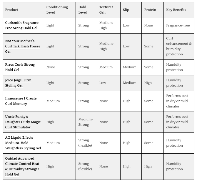 Ouidad Advanced Climate Control Heat & Humidity Stronger Hold Gel This is one of the most conditioning gels in this lineup. It provides strong hold with slip and flexibility while holding up well in humidity. Strong Hold Gel Comparison ChartHow to Choose⮕ If your curls are soft and collapse easily: start in Category 1 or Category 2. ⮕ If you have soft-finish curls but don’t like the feeling of texture: look closely at Category 2. ⮕ If you live in a dry or mild climate: category 3 may perform especially well. ⮕ If your curls feel rough or dry and prefer slip: category 4 is a strong starting point. Remember, you can use gels outside your typical category depending on how you layer them and what feel you prefer. Strong hold gels are not all the same. The goal is choosing the right type for your curls, not just the strongest label. Final ThoughtsSome gels prioritize texture and grip. Others prioritize conditioning and flexibility. Understanding that distinction is what keeps you from constantly switching products. If you want to shop these gels side by side, use the comparison chart above. If strong hold never seems to last for you no matter what gel you use, my Strong Hold Method breaks down how application impacts longevity. If you want personalized support choosing the right products and testing them properly, enrollment for my Group Curl Coaching Program closes March 15!