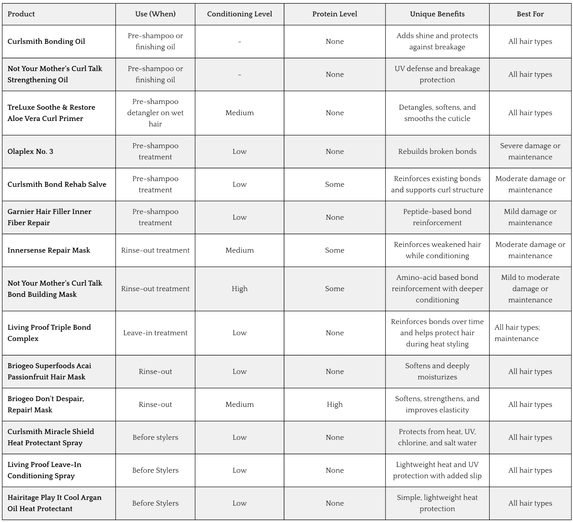 TreLuxe Soothe & Restore Aloe Vera Curl Primer Pre-Shampoo Bond Repair Treatments (Most Intensive)Pre-shampoo bond repair treatments are the most targeted strengthening products in this guide. They’re applied before shampooing so they can interact with the hair without interference from conditioners or stylers. Not all bond treatments work the same way. Some are capable of repairing broken bonds, while others reinforce existing structure. Understanding that distinction helps determine which option is appropriate for your level of damage. Olaplex No. 3Use: Pre-shampoo treatment